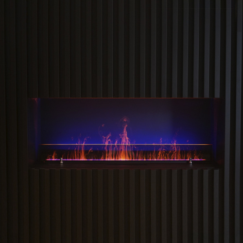 Синяя подсветка придает пламени особый цвет, пламя становится таким, как будто горит голубое топливо, язычки пламени становятся с розово-синем оттенком. Выглядит это необычно и очень красиво.
