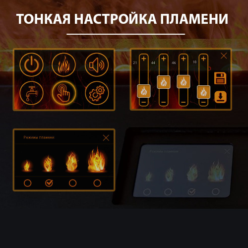 Электрокамин оснащен сенсорным дисплеем при помощи которого производится управление всеми функциями устройства. Так же для управления основными функциями, камин комплектуется пультом дистанционно управления, работающим на частоте 433,92 Мгц.