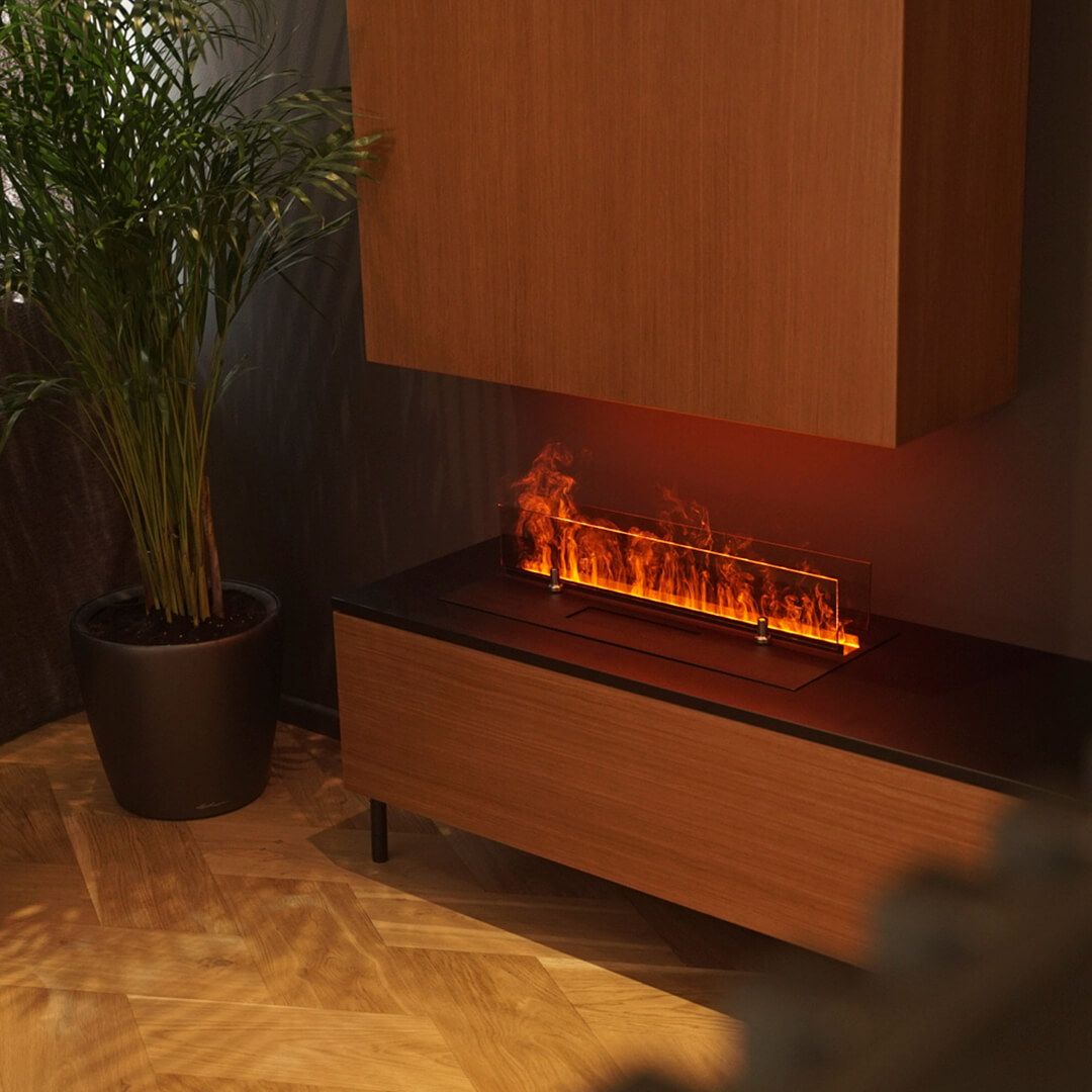 Реалистичное пламя образуется при проецировании лучей на пару. Такая имитация огня имеет довольно высокую степень схожести с реальным пламенем и является полностью безопасной для окружающих, а испаряющаяся вода, повышает влажность воздуха, создает комфортный микроклимат.
