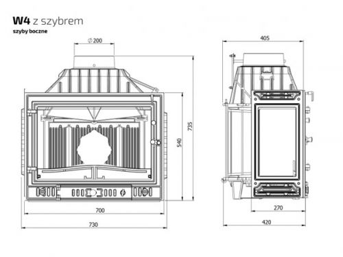 • встроенный шибер, регулирует силу тяги в дымоходе камина;