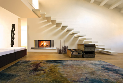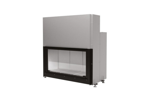 Закрытая дровяная топка со стеклянным фасадом, футеровкой топочной камеры из огнеупорного материала Alutec® и подъемным механизмом открывания дверцы (вертикально вверх), позволяющим визуально освободить топку от дополнительных линий, углов и ребер, тем самым сохраняя и подчёркивая её линейную конструкцию.