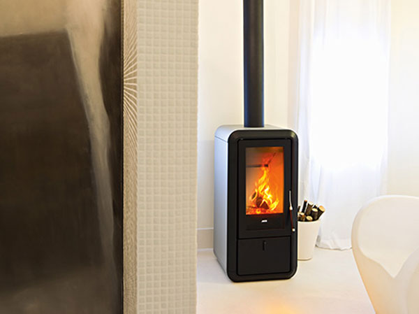 Дровяная печь с современным дизайном оснащена силиконовой ручкой для безопасного открывания дверцы, металлическими элементами по бокам и сверху (доступные цвета: Black and Aluminium).