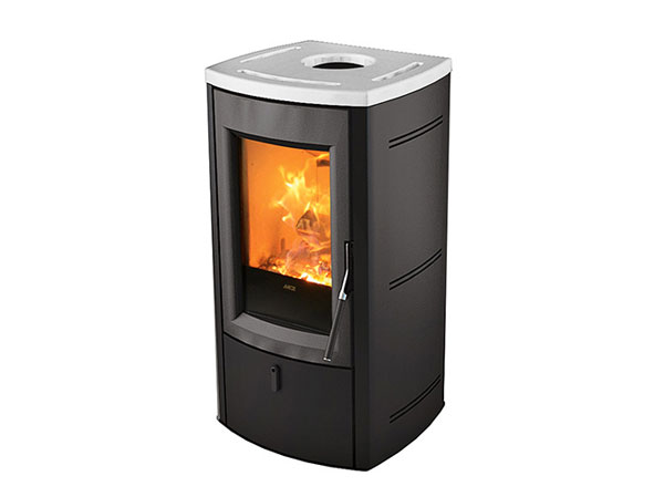 Дровяная печь с современным дизайном оснащена силиконовой ручкой для безопасного открывания дверцы, металлическими элементами по бокам и керамическим верхом (доступные цвета: Bordeaux, White, Black, Soapstone).