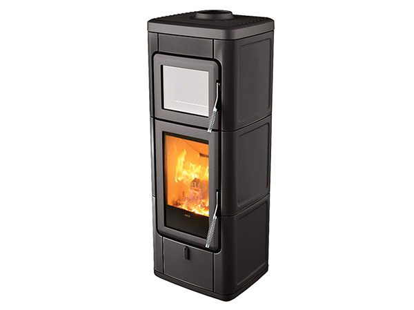 Дровяная печь с классическим дизайном оснащена пружинной ручкой, чугунным верхом и керамическими элементами по бокам (доступные цвета: White, Bordeaux, Warm Grey, Black). Встроенная духовка.