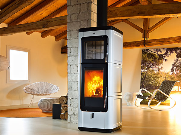Дровяная печь с классическим дизайном оснащена пружинной ручкой, чугунным верхом и керамическими элементами по бокам (доступные цвета: White, Bordeaux, Warm Grey, Black). Встроенная духовка.