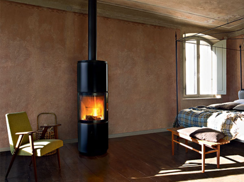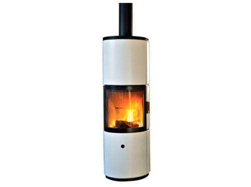 Дровяная печь округлой формы с современным дизайном оснащена системой накапливания тепла и обогрева помещения в ночное время Overnight (Овернайт), скрытым рычагом управления горением, удобной ручкой с автоматическим механизмом закрывания дверцы, керамическими элементами по бокам чёрного или белого цвета.
