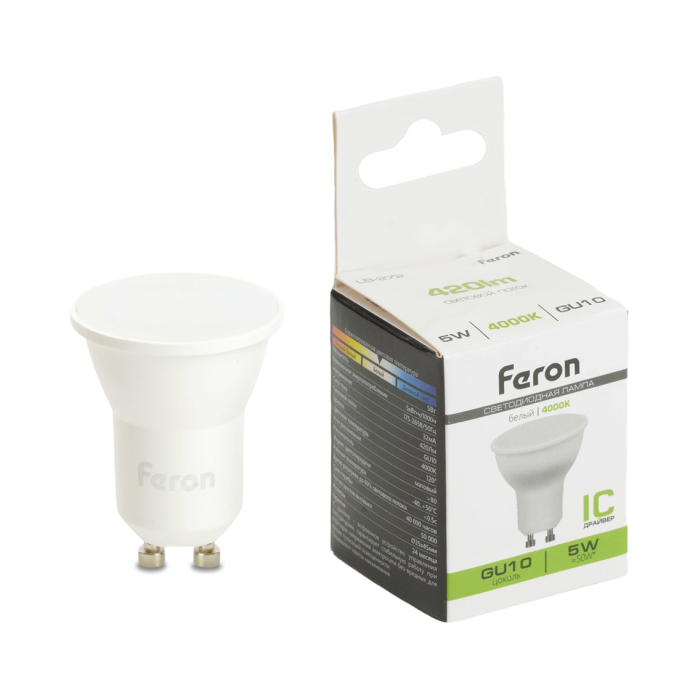 Светодиодная лампа Feron LB-272 — это рефлекторная лампа мощностью 5 Вт с цоколем GU10 и цветовой температурой 4000 К. Матовый рассеиватель обеспечивает равномерное распределение света. Размеры лампы — 45 x 35 мм. Индекс цветопередачи — 80, коэффициент пульсации — менее 5%, световой поток — 420 лм.