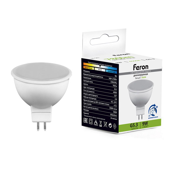 Светодиодная диммируемая лампа Feron LB-561. Её мощность составляет 9 Вт, напряжение — 230 В, а цветовая температура — 4000 К. Матовый белый рассеиватель обеспечивает равномерное распределение света. Световой поток составляет 780 лм.