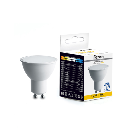 Светодиодная диммируемая лампа мощностью 9 Вт с цоколем GU10 и цветовой температурой 2700 К. Вид лампы — рефлекторный, материал корпуса — пластик, размеры — длина 57 мм и ширина 50 мм. Диммируется, индекс цветопередачи — 80, коэффициент пульсации — <5, световой поток — 760 лм. Аналог лампы накаливания мощностью 90 Вт.