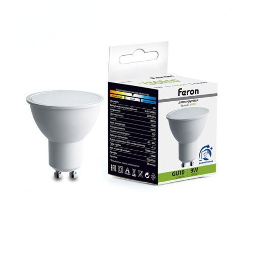 Светодиодная диммируемая лампа Feron LB-561 обеспечивает дневной свет 4000 К. Она имеет матовую белую поверхность и мощность 9 Вт при напряжении 230 В. Размеры лампы составляют 57 x 50 мм, а световой поток — 780 лм.