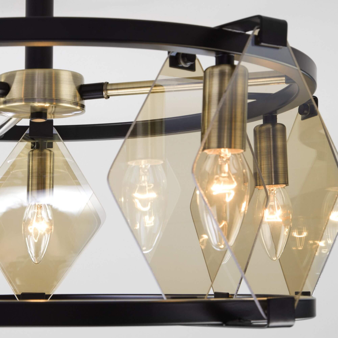 Люстра 60116/5 оснащена пятью сменными лампами, что обеспечивает яркое и равномерное освещение помещения. Диаметр потолочной чаши составляет 120 миллиметров, а цоколь ламп - E14. Арматура светильника выполнена из металла, окрашенного в бронзу и черный цвет, что придает ему изысканный и современный вид. Плафон / абажур изготовлен из стекла янтарного цвета, который создает уютную атмосферу и при этом не требует сложного ухода.
