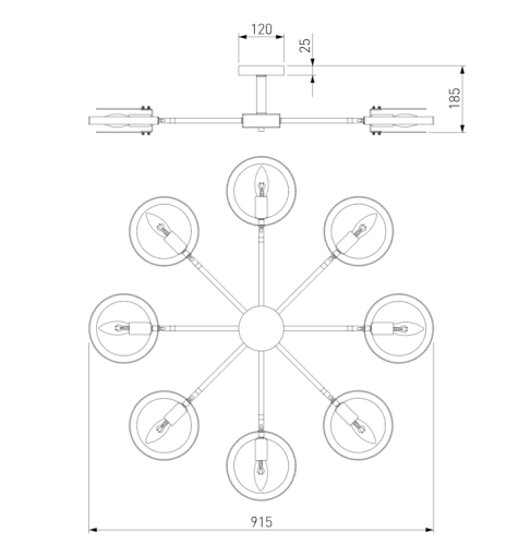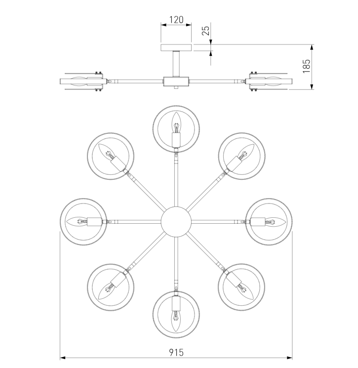 Люстра 70121/8 представляет собой стильное и функциональное решение для освещения вашего дома. Размеры этой модели составляют: длина - 915 миллиметров, ширина - 915 миллиметров и высота - 185 миллиметров. Люстра имеет восемь источников света в виде сменных ламп, что обеспечивает оптимальное освещение помещения. Диаметр потолочной чаши составляет 120 миллиметров, что позволяет люстре гармонично вписаться в интерьер любого помещения.