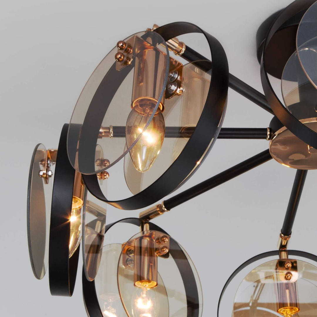 Плафон/абажур люстры изготовлен из стекла, а его цвет - янтарный. Такой материал плафона обеспечивает равномерное распределение света и придает помещению уют. Тип крепления данной модели - планка. Это гарантирует простоту и надежность монтажа люстры на потолок. Торговая группа Loft подчеркивает современный и стильный дизайн этой модели.