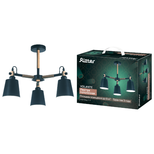 Потолочная люстра Volante 52447 2 от китайской фабрики Ritter подходит для размещения в гостиной, в спальне, на кухне, над обеденным столом, в стиле классическом, модерн. Материал изготовления – металл, дерево, цвет черный. Модель имеет 3 плафона (металл). Цоколь E27. Мощность 120 W, питание от сети 220 V, cтепень защиты от влаги и пыли IP20, I класс электробезопасности. Габариты: длина – 56 см, ширина – 56 см, высота – 43 см, крепление на монтажную пластину. Технические особенности: регулировка направления света. В комлекте светильник, монтажный комплект, паспорт.