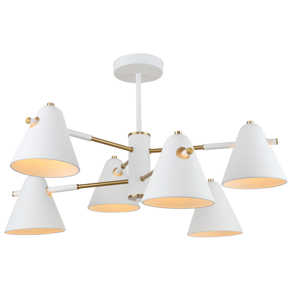 Тип цоколя Е14 является одним из самых популярных и универсальных, так как он подходит для большинства стандартных ламп. Цвет арматуры люстры - белый и латунь, что делает ее универсальной и подходящей практически для любого интерьера. Цвет плафона также белый, что позволяет свету от ламп равномерно рассеиваться по помещению.