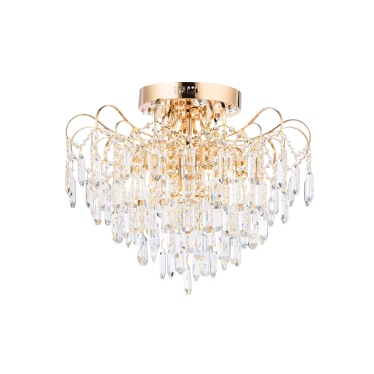 Плафоны люстры выполнены из хрусталя, что придаёт изделию роскошный вид. Основание люстры металлическое, а цвет арматуры — золотой. Это сочетание материалов и цвета делает люстру изысканной и современной.