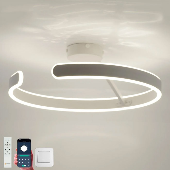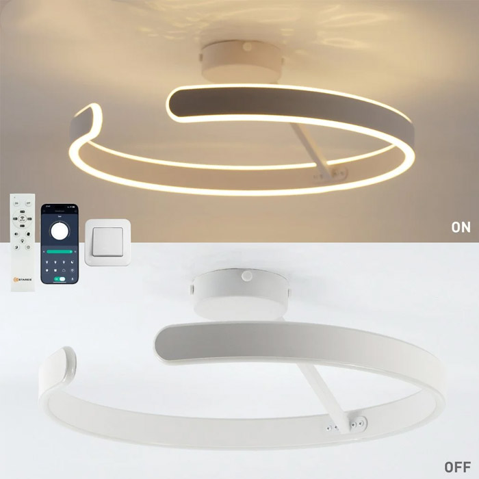 Люстра светодиодная "MADERA" 80W R-APP-500x170-WHITE/WHITE-220-IP20 с дистанционным пультом управления (ДПУ) и возможностью управления с телефона через специальное приложение позволяет изменять цвет свечения, яркость и включать функцию ночника. Управление осуществляется с помощью стационарного выключателя, ДПУ и приложения для iOS и Android. Светильник имеет регулируемый по высоте подвес, алюминиевый корпус, стеклянный рассеиватель и встроенный драйвер. Крепление осуществляется на скобу. Размеры светильника составляют 500 × 170 мм, угол рассеивания — 180 градусов, степень защиты — IP20. Цвет корпуса и рассеивателя — белый соответственно. Световой поток варьируется от 400 до 8000 люмен, а индекс цветопередачи составляет 80.