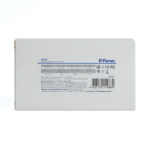 Датчик движения FERON SEN32 на касание, встраиваемый, IP20, 12/24V, 36/72W, расстояние обнаружения касание, цвет серебро, 22*22*16мм